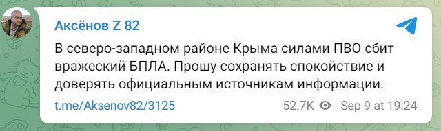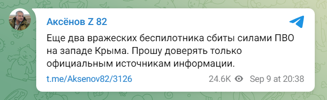 "Ще два ворожі безпілотники збиті силами ППО на заході Криму. Прошу довіряти тільки офіційним джерелам інформації", — додав зрадник.