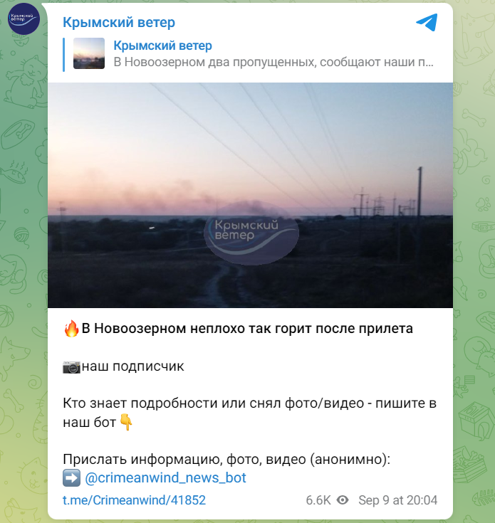 Своєю чергою місцевий телеграм-канал "Крымский ветер" повідомив, що палає саме в Новоозерному після "прильоту".