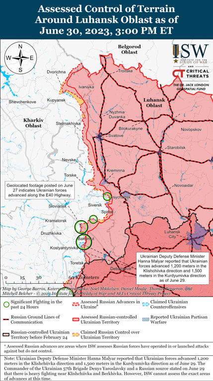 В Інституті вивчення війни (ISW) зазначають, що російські та українські війська продовжували вести бойові дії на лінії Куп’янськ — Сватове — Кремінна. ЗСУ відбили російські атаки на Новоселівському напрямку, поблизу Білогорівки та Роздолівки.