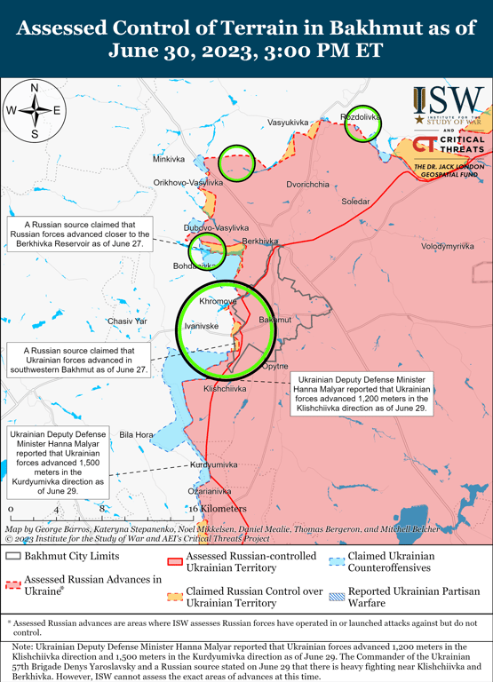 Українські сили продовжували контратаку та досягли певних успіхів у районі Бахмута. Так, ЗСУ досягли часткового успіху на лінії Привілля — Залізнянське та закріпили нові позиції. Російські військкори стверджували, що українські сили продовжували атакувати на північ від Бахмута поблизу Ягідного, Берхівки, Дубово-Василівки; на захід від Бахмута в районі Іванівського; на південний захід від Бахмута поблизу Північного, Озарянівки, Курдюмівки та Кліщіївки.