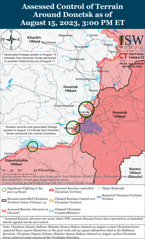 Російські та українські війська продовжували бойові дії на лінії Авдіївка-Донецьк і не просувалися. Український Генштаб повідомив, що українські війська відбили російські наземні атаки на південь від Авдіївки та поблизу Мар’їнки (безпосередньо на південний захід від Донецька) та Красногорівки ( 22 км на південний захід від Авдіївки).