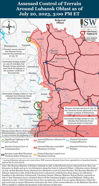 В Інституті вивчення війни (ISW) зазначають, що російські окупанти продовжують атакувати на лінії Куп’янськ — Сватове — Кремінна. Російські сили просунулися через шосе N26 Куп’янськ — Сватове на південь від Новоселівського (15 км на північний захід від Сватового).