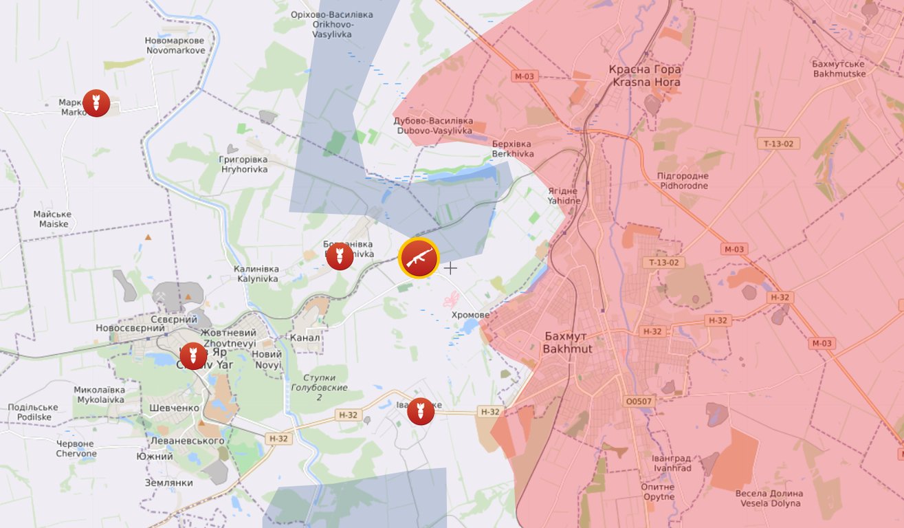 ЗСУ продовжують контрнаступ на північному та південному флангах Бахмута та мають успіхи. Так, українські війська просунулися в лісовому районі Кліщіївки (7 км на південний захід від Бахмута).