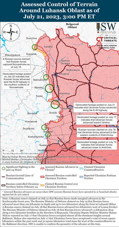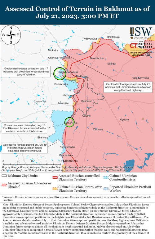 ЗСУ продовжували контрнаступати на Бахмутському напрямку та досягли успіхів. Геолокаційні кадри показують, що українські війська просуваються вздовж траси E40 (Бахмут — Слов’янськ) на північний схід від Оріхово-Василівки (11 км на північний захід від Бахмута).