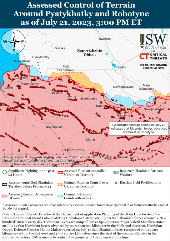 У Генштабі також повідомили, що ЗСУ досягли успіху на напрямках Новоданилівка — Вербове (до 16 км на південний схід від Оріхова) і Новоданилівка — Роботине (до 12 км на південь від Оріхова).