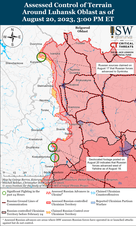 Українські сили продовжували обмежені контрнаступальні операції в районі Бахмута і, можливо, просунулися 20 серпня. Геолокаційні кадри показують, що українські сили досягли позицій далі на захід і північ від Андріївки (10 км на південний захід від Бахмута).