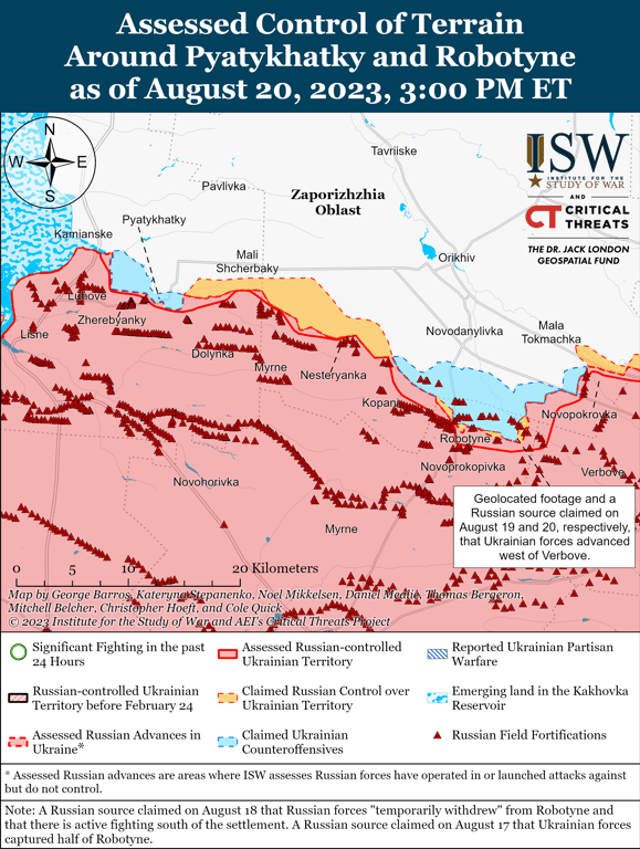 Українські війська вели наступальні дії на заході Запорізької області і нещодавно просунулися вперед. Геолокаційні кадри показують, що українські сили нещодавно просунулися на схід від Роботиного (10 км на південь від Оріхова).