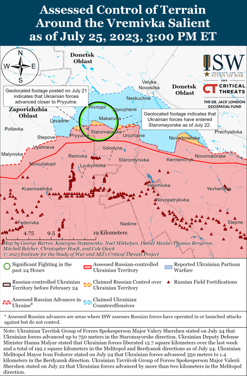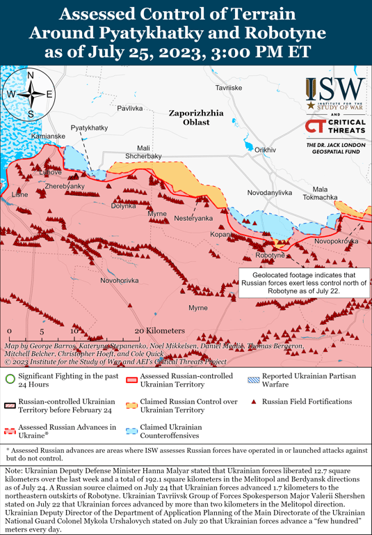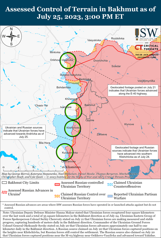 В Інституті вивчення війни (ISW) зазначають, що ЗСУ контрнаступали на Бахмутському напрямку та досягли тактично значних успіхів на південь від Бахмута. Так, українські війська просувались на південь від Кліщіївки (7 км на південний захід від Бахмута).