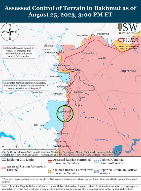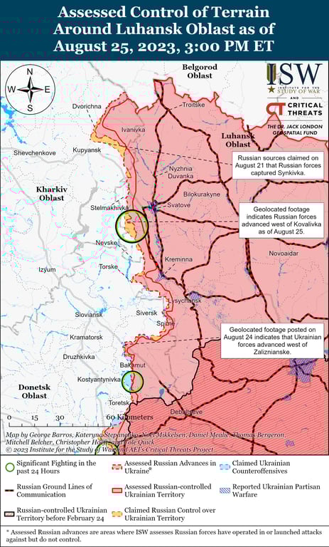 В Інституті вивчення війни (ISW) зазначають, що станом на сьогодні, 26 серпня, за даними Генштабу ЗСУ, російські війська вели безуспішні наступальні дії поблизу Новоєгорівки (17 км на південний захід від Сватового).