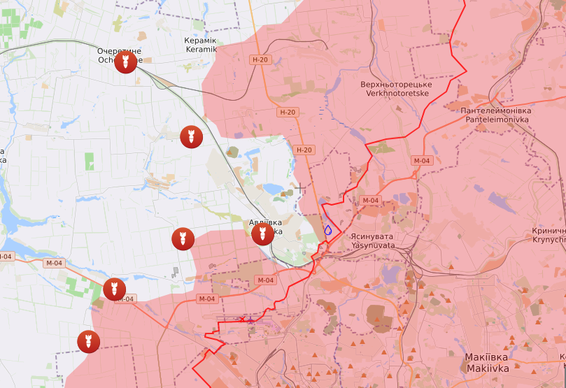 - Червоним кольором на мапі позначені території, окуповані Росією до та під час повномасштабної війни.