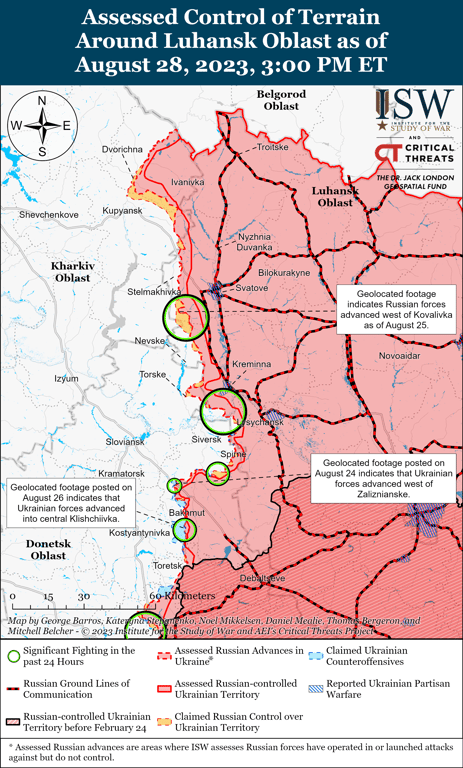 В Інституті вивчення війни (ISW) зазначають, що станом на 29 серпня російські війська продовжували зосереджувати наступальні зусилля на рубежі Сватове — Кремінна, але не просувалися. Генштаб України повідомив, що українські війська відбили наступ росіян на Новоєгорівку (15 км на південний захід від Сватового).