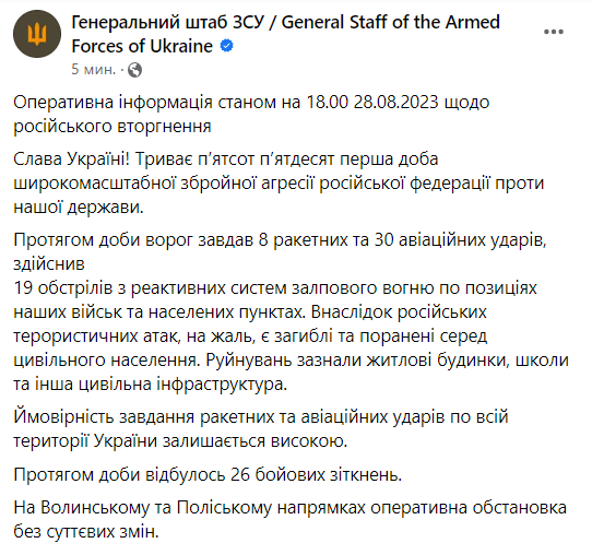 Оперативна ситуація в Україні станом на 29 серпня 2023 року