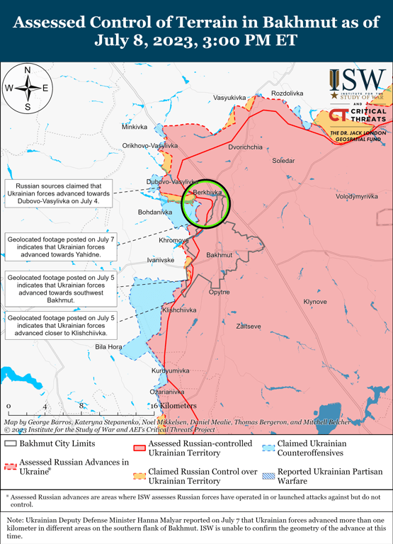 В Інституті вивчення війни (ISW) зазначають, що за словами заступниці міністра оборони України Ганни Маляр, українські сили просунулися більш ніж на 1 км у невизначених районах на південь від Бахмута. Маляр зазначила, що бої також тривають на північ від міста без змін на російських чи українських позиціях.