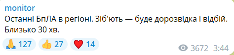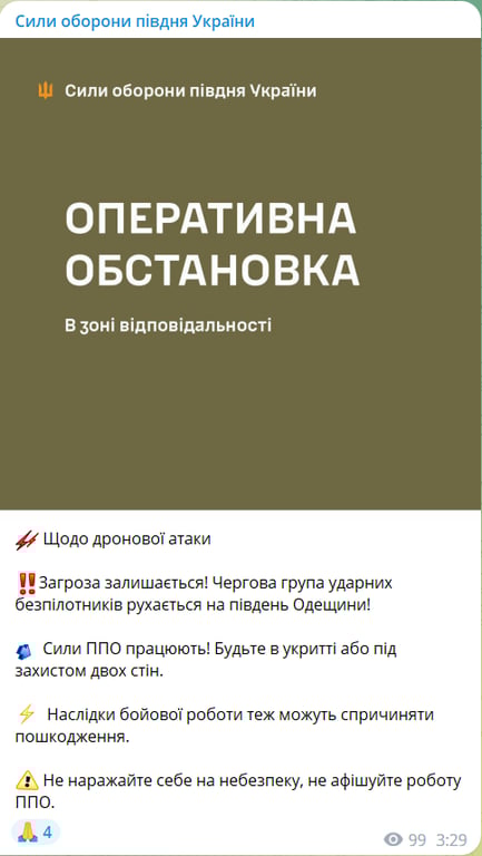 Також українські захисники додали, що загроза триває. Чергова група ударних БпЛА прямує на південь Одеської області.