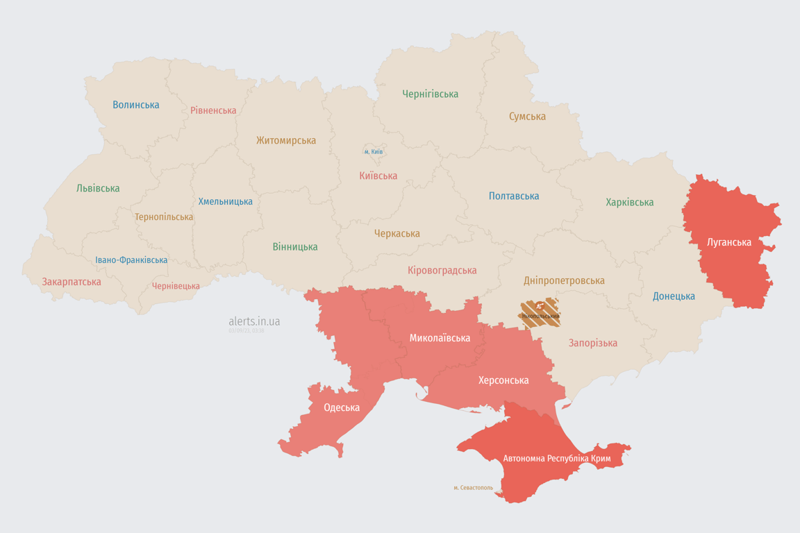 Оновлено 03:38. Наразі повітряна тривога зберігається в трьох областях — Одеській, Миколаївській та Херсонській. Традиційно "червоні" Луганщина та тимчасово окупований Крим.