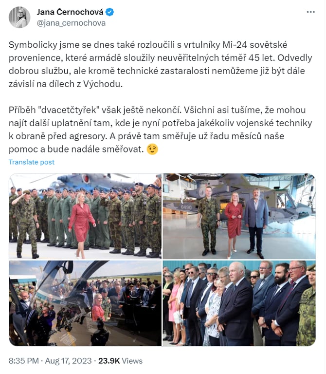 Міністрка розповіла, що Чехія "більше не може покладатися на запчастини зі Сходу". Також вона додала, що не вся радянська техніка виходиться з експлуатації, а поки що лише гелікоптери Мі-24.