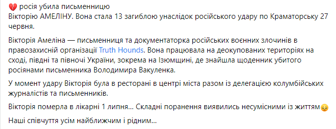Померла українська письменниця Вікторія Амеліна. Вона отримала тяжке поранення під час ракетної атаки на ресторан Краматорська, яка сталася у вівторок, 27 червня.