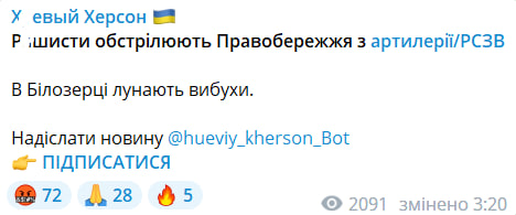 Оновлено 03:26. У Білозерці Херсонської області чути серію вибухів. За даними місцевих ЗМІ, окупанти обстрілюють регіон з артилерії.