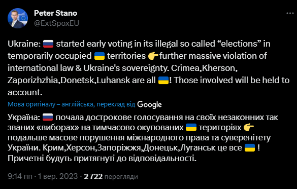 "Росія розпочала дострокове голосування на своїх незаконних так званих виборах на тимчасово окупованих українських територіях. Це подальше масове порушення міжнародного права та суверенітету України", — написав Стано.