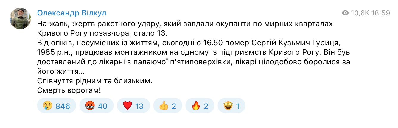 "На жаль, жертв ракетного удару, який завдали окупанти по мирних кварталах Кривого Рогу позавчора, стало 13. Від опіків, несумісних із життям, сьогодні о 16.50 помер Сергій Кузьмич Гуриця, 1985 р.н., працював монтажником на одному із підприємств Кривого Рогу. Він був доставлений до лікарні з палаючої п'ятиповерхівки, лікарі цілодобово боролися за його життя. Співчуття рідним та близьким. Смерть ворогам!" — написав Вілкул.