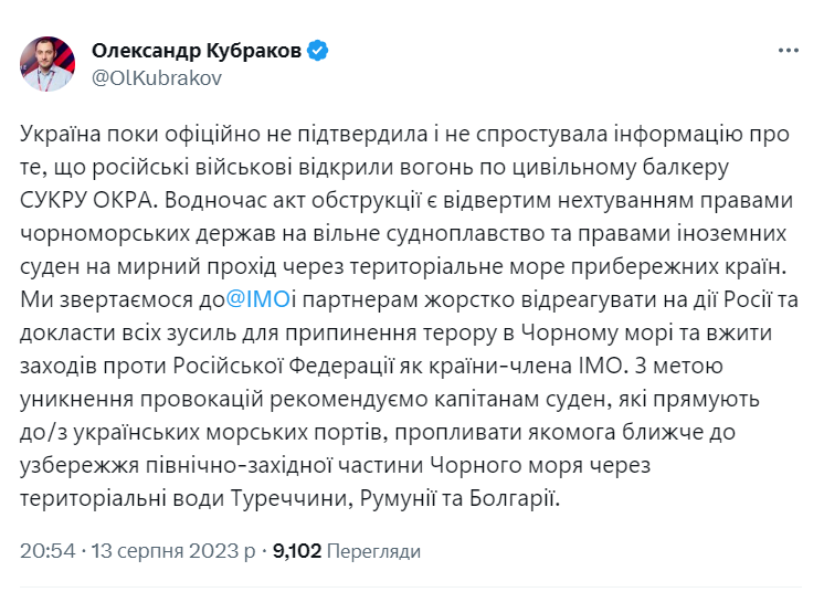 Міністр розвитку громад, територій та інфраструктури України Олександр Кубраков заявив, що Росія порушила права чорноморських держав та іноземних мореплавців на вільне судноплавство. Як відомо, РФ зупинила цивільне судно в Чорному морі.