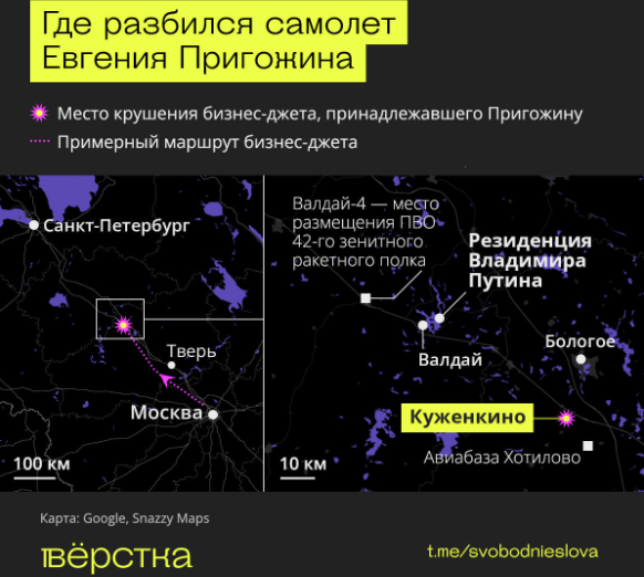Версію про збиття літака ППО озвучували раніше і деякі російські "воєнкори". Так, видання "Верстка" пише, що борт Пригожина розбився за 50 км від місця розташування систем ППО 42-го зенітного ракетного полку ЗС РФ. Крім цього, неподалік знаходиться авіабаза "Хотілово".