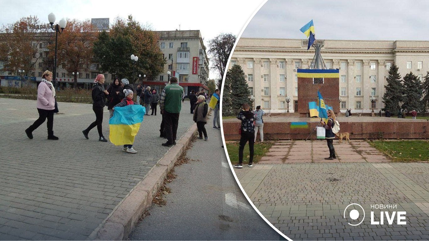 Люди з українськими прапорами вийшли на вулиці Херсона, чекають ЗСУ