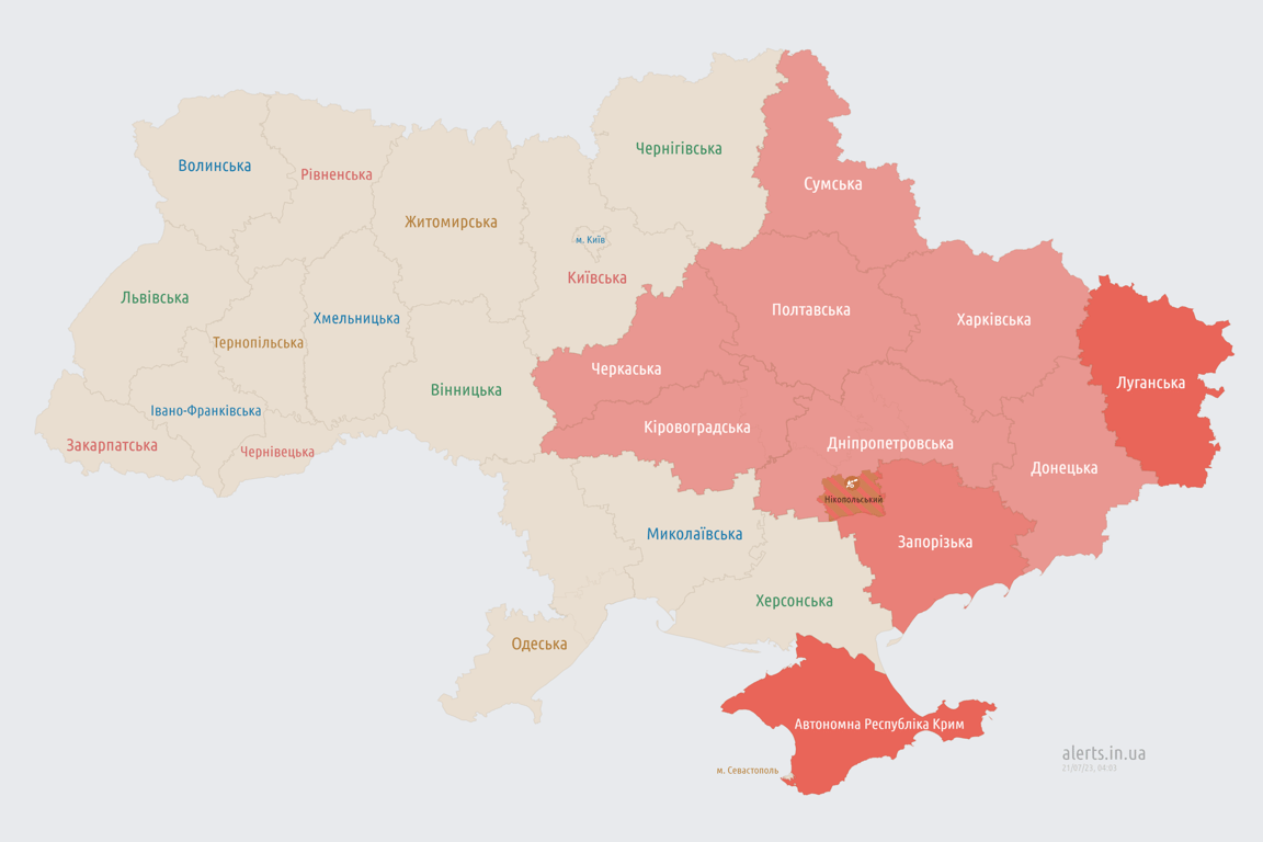 Під ранок 21 липня близько 4-ї години Україною знову почала ширитися повітряна тривога. Наразі "червоними" лишаються східні області. Також є загроза ракетної атаки.