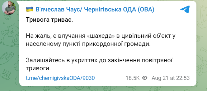 У Чернігівській області в одному із населених пунктів прикордонної громади російський "шахед" влучив у об'єкт цивільної інфраструктури. Наразі повітряна тривога триває досі.