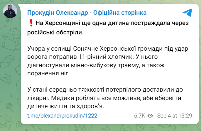 "Учора у селищі Сонячне Херсонської громади під удар ворога потрапив 11-річний хлопчик. У нього діагностували мінно-вибухову травму, а також поранення ніг. У стані середньої тяжкості потерпілого доставили до лікарні. Медики роблять все можливе, аби вберегти дитяче життя та здоровʼя", — зазначив він.