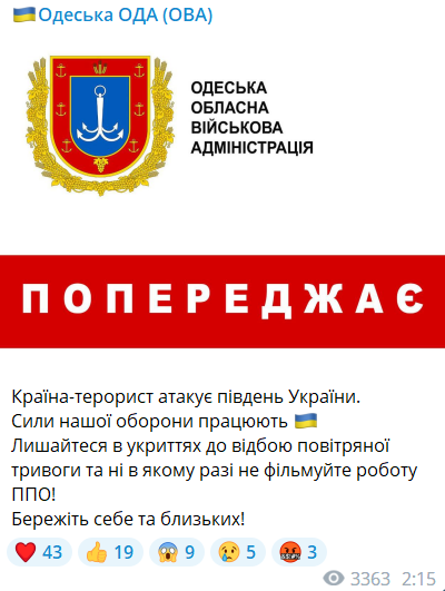 Оновлено 02:17. "Сили нашої оборони працюють. Лишайтеся в укриттях до відбою повітряної тривоги та ні в якому разі не фільмуйте роботу ППО", — заявили в Одеській ОВА.