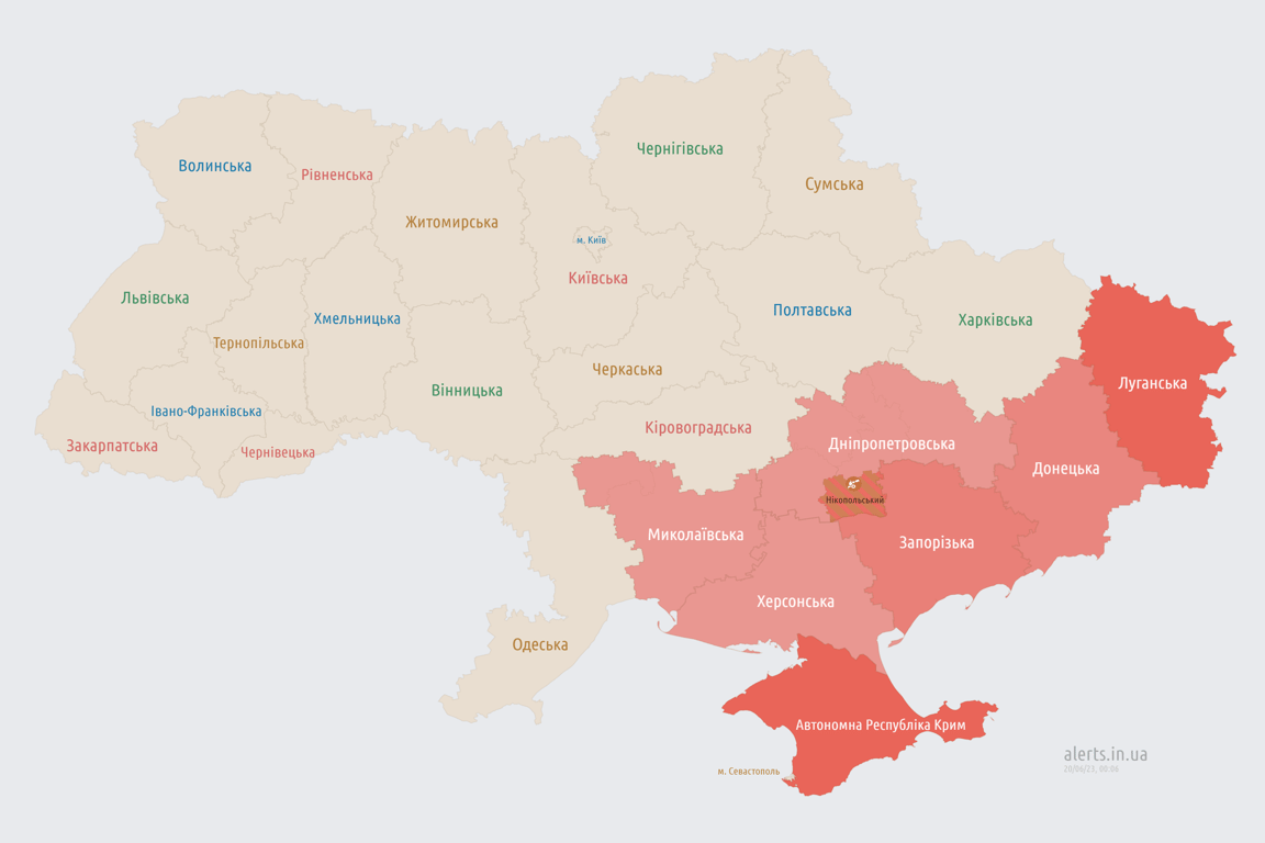 Оновлено 00:13. Повітряна тривога в низці південних та східних областей, зокрема в Миколаївській, Дніпропетровській, Донецькій, Запорізькій та Херсонській областях.