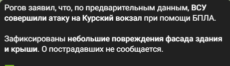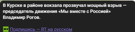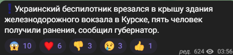 "У Курську в районі вокзалу пролунав гучний вибух", — написав він у Telegram.