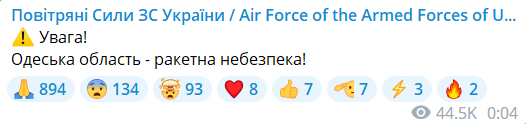 Оновлено 00:10. Повітряні сили повідомляють про ракетну небезпеку для Одещини.