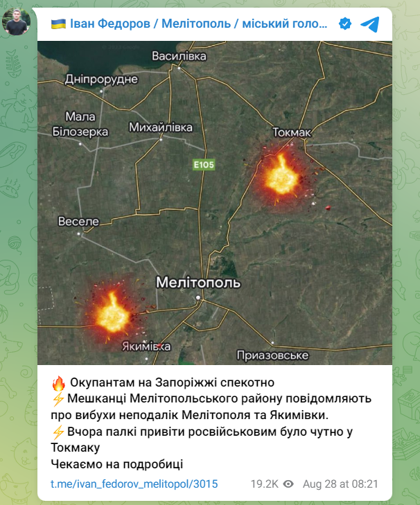 "Окупантам на Запоріжжі спекотно. Мешканці Мелітопольського району повідомляють про вибухи неподалік Мелітополя та Якимівки. Вчора палкі привіти росвійськовим було чутно у Токмаку. Чекаємо на подробиці", — написав він.