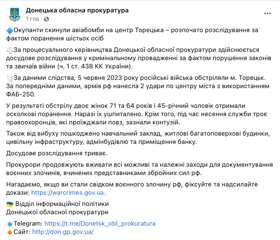 Сьогодні, 5 червня, Росія обстріляла місто Торецьк Донецької області. За попередньою інформацією, російська армія нанесла два удари по центру міста з використанням ФАБ-250.