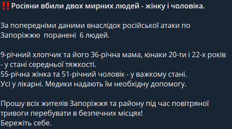 "Росіяни вбили двох мирних людей — жінку і чоловіка. За попередніми даними, внаслідок російської атаки по Запоріжжю поранено шестеро людей", — розповів Федоров.
