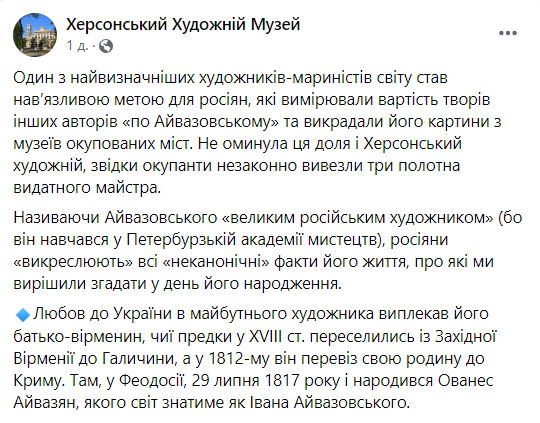 "Один з найвизначніших художників-мариністів світу став нав’язливою метою для росіян, які вимірювали вартість творів інших авторів "по Айвазовському" та викрадали його картини з музеїв окупованих міст. Не оминула ця доля і Херсонський художній, звідки окупанти незаконно вивезли три полотна видатного майстра", — йдеться у повідомленні музею.