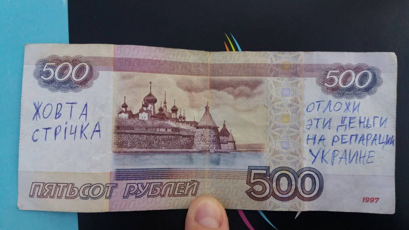 Для цього вони почали робити на російських рублях, які перебувають в обігу на захоплених територіях українських областей, проукраїнські написи.