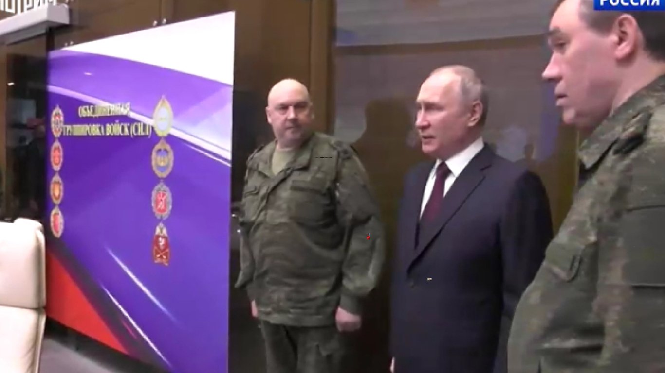 Їх зустрічає заступник командувача угрупованням російських військ в Україні Сергій Суровікін і нібито військові. Путін їх вітає і сідає.