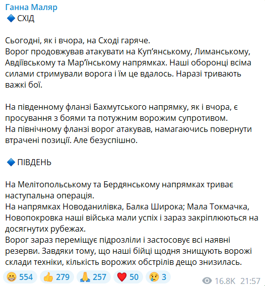 "На Мелітопольському та Бердянському напрямках триває наступальна операція. На напрямках Новоданилівка, Балка Широка; Мала Токмачка, Новопокровка наші війська мали успіх і зараз закріплюються на досягнутих рубежах", — розповіла Маляр.