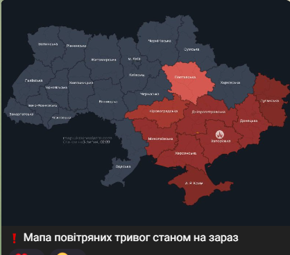 Мапа повітряних тривог в Україні станом на зараз виглядає таким чином: