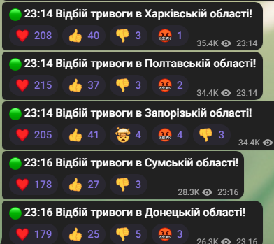 Моніторингові канали повідомляють про відбої тривог по областях.
