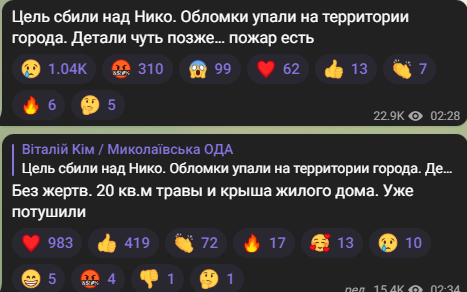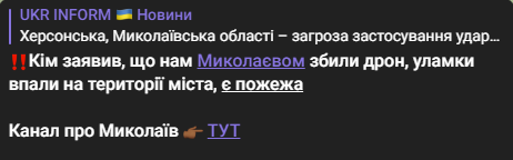 "Ціль збили над Миколаєвом. Уламки впали на території міста. Деталі трохи пізніше, пожежа є", — йдеться у повідомленні Кіма.