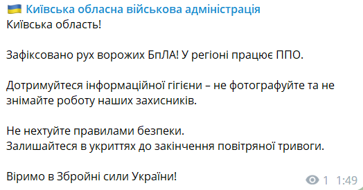 Оновлено 01:55. У Київській ОВА повідомили, що в регіоні зафіксовано рух ворожих БпЛА, також в області працює ППО.