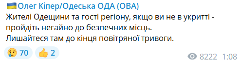 Оновлено 01:21. Очільник Одеської ОВА Олег Кіпер закликає мешканців та гостей області пройти в укриття.