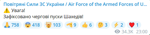 23:00 Зафіксовано третю хвилю запуску "Шахедів".
