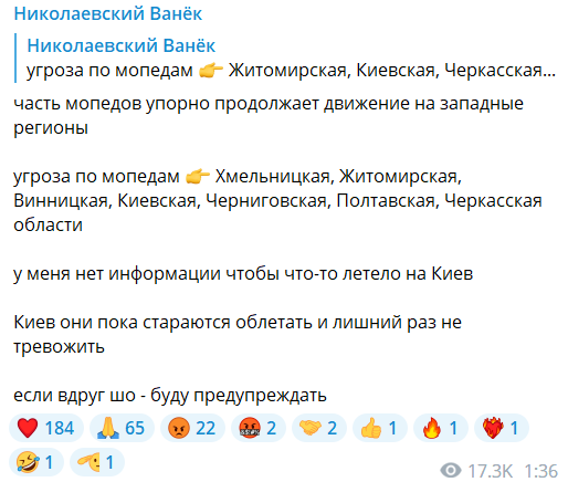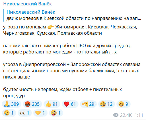 Оновлено 01:12. "Загроза по мопедам (БпЛА. — Ред.) — Житомирська, Київська, Черкаська, Чернігівська, Сумська, Полтавська області", — повідомляє "Ванек".