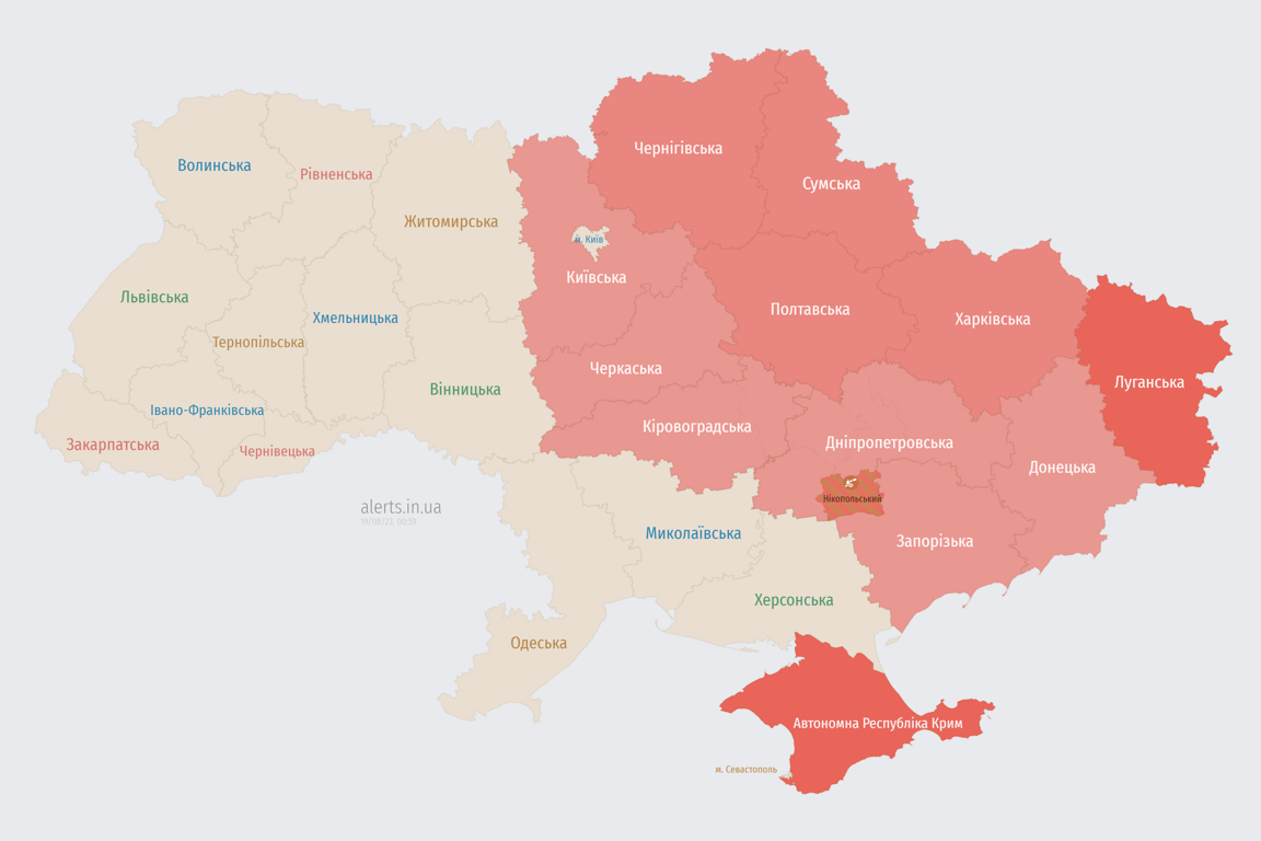 Оновлено 01:40. Тим часом небезпека потихеньку перекочується й на західні області. Так, повітряна тривога завітала в Житомирську, Вінницьку та Хмельницьку області.