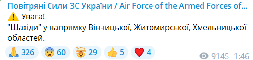 Оновлено 01:48. "Шахіди" у напрямку Вінницької, Житомирської, Хмельницької областей", — попереджають Повітряні сили.